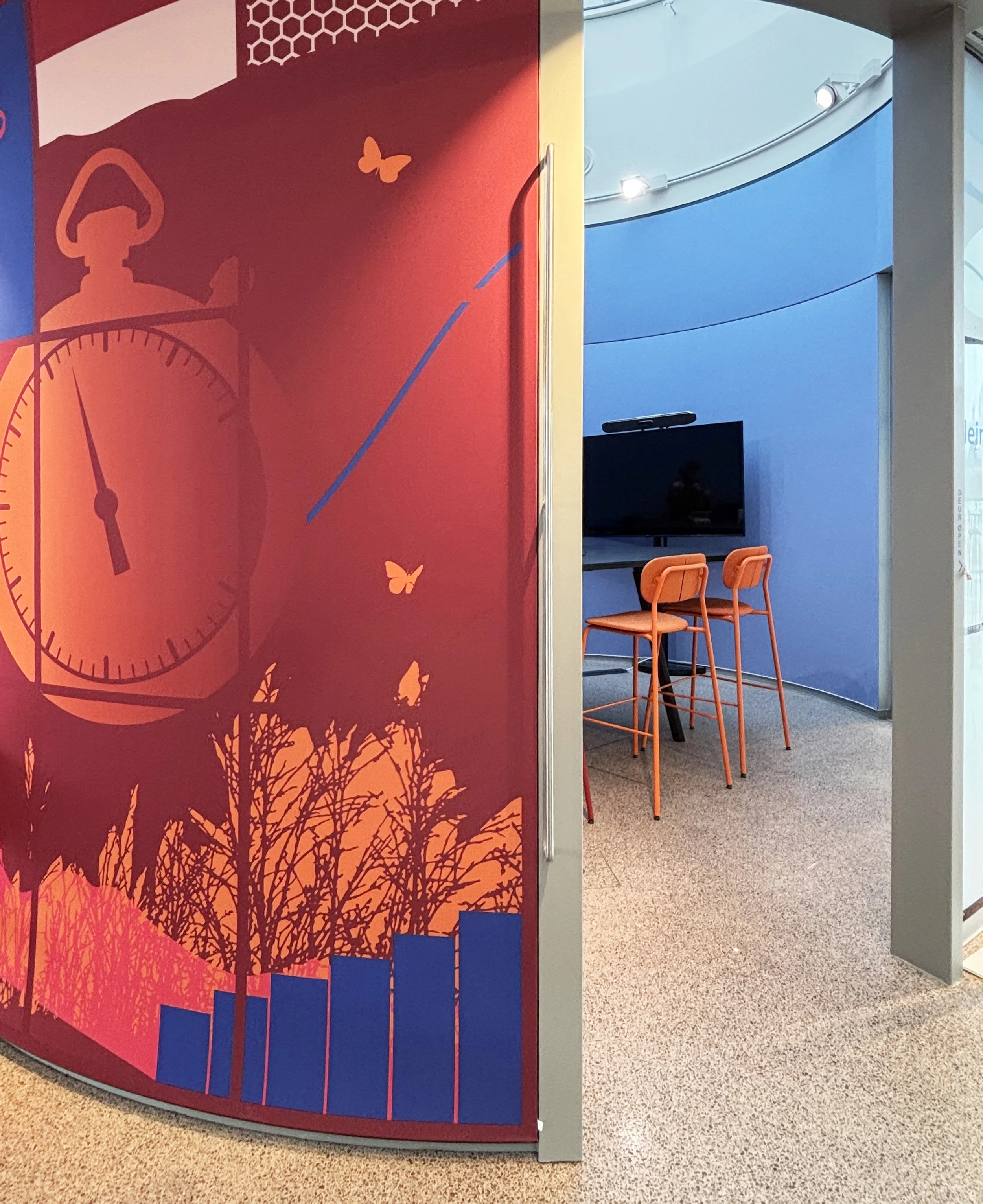 The existing cylindrical meeting rooms have been re-cladded with specially designed visuals by Odilo Girod.